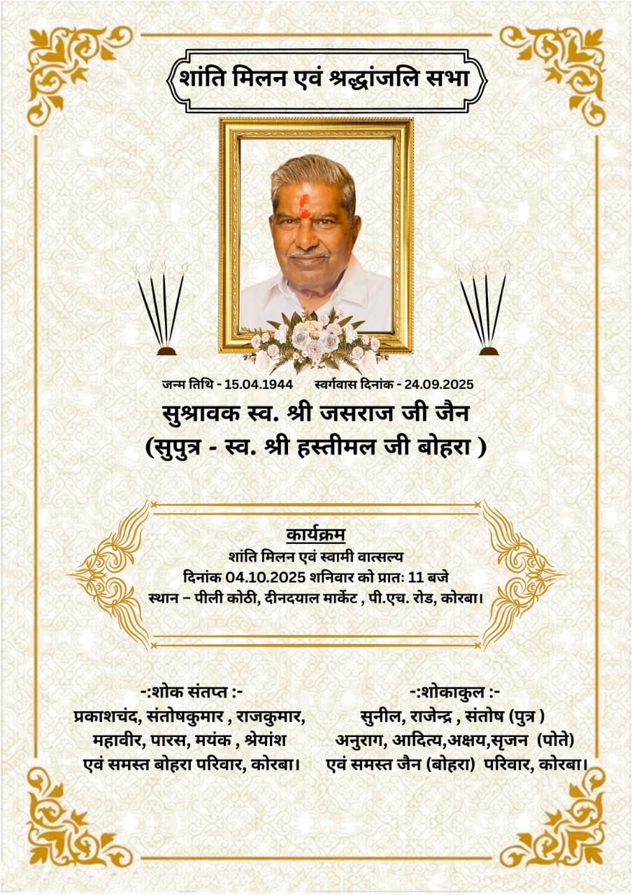 “वीर छत्तीसगढ़” परिवार की ओर से आदरणीय बाबूजी जसराज जैन जी को कोटि-कोटि नमन और भावभीनी श्रद्धांजलि।